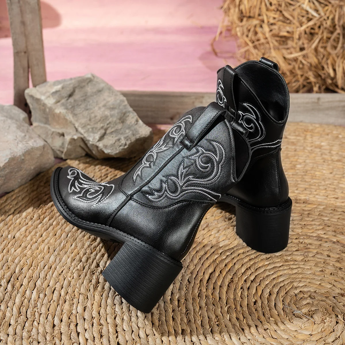 Los botines cowboy mujer destacan por su diseño inspirado en el auténtico calzado del oeste. Su tacón medio y punta afilada estilizan la figura, mientras que los detalles bordados aportan personalidad y elegancia. Son perfectos tanto para un look casual como para un outfit más atrevido.