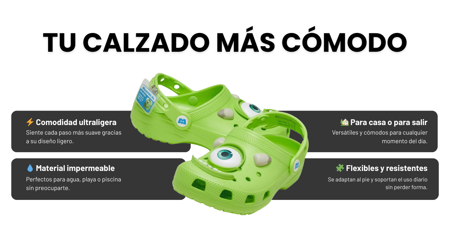 Zuecos ligeros y extremadamente cómodos diseñados para el uso diario. Su material flexible y resistente al agua los convierte en una opción práctica para casa, playa o paseos informales.